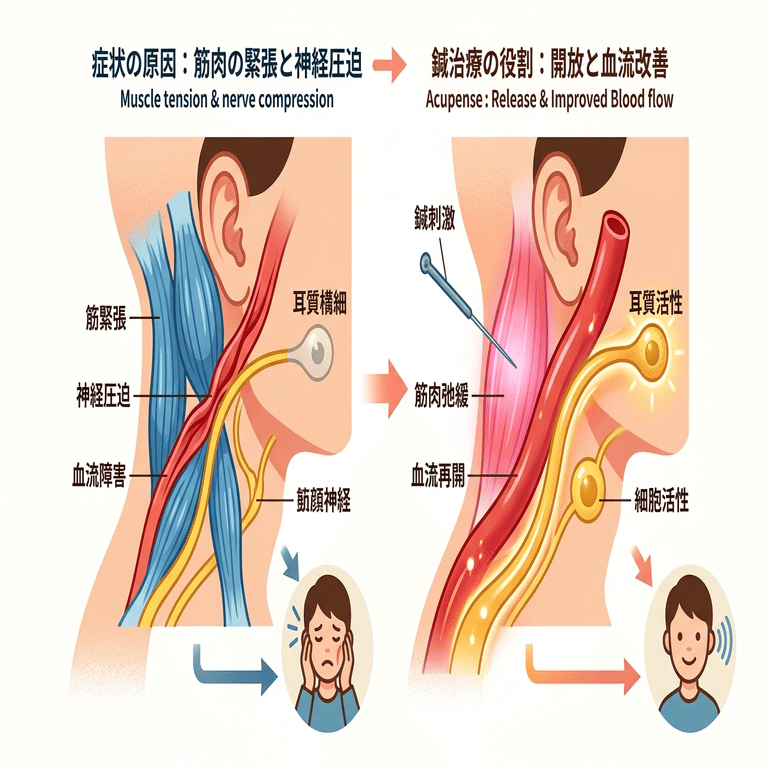 特に内耳のような繊細な場所には、新鮮な血液が不可欠です。鍼の刺激によって血管を広げ、休眠状態にある細胞に酸素と栄養を送り届けます。